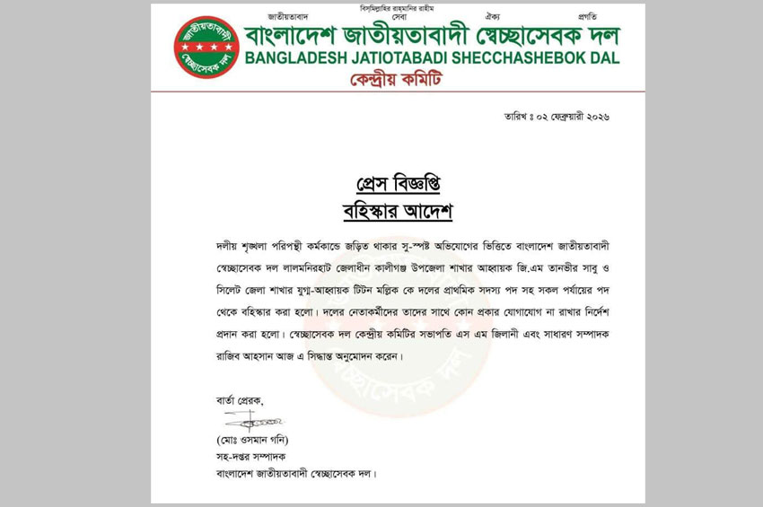 সিলেট জেলা স্বেচ্ছাসেবক দল নেতা বহিষ্কার